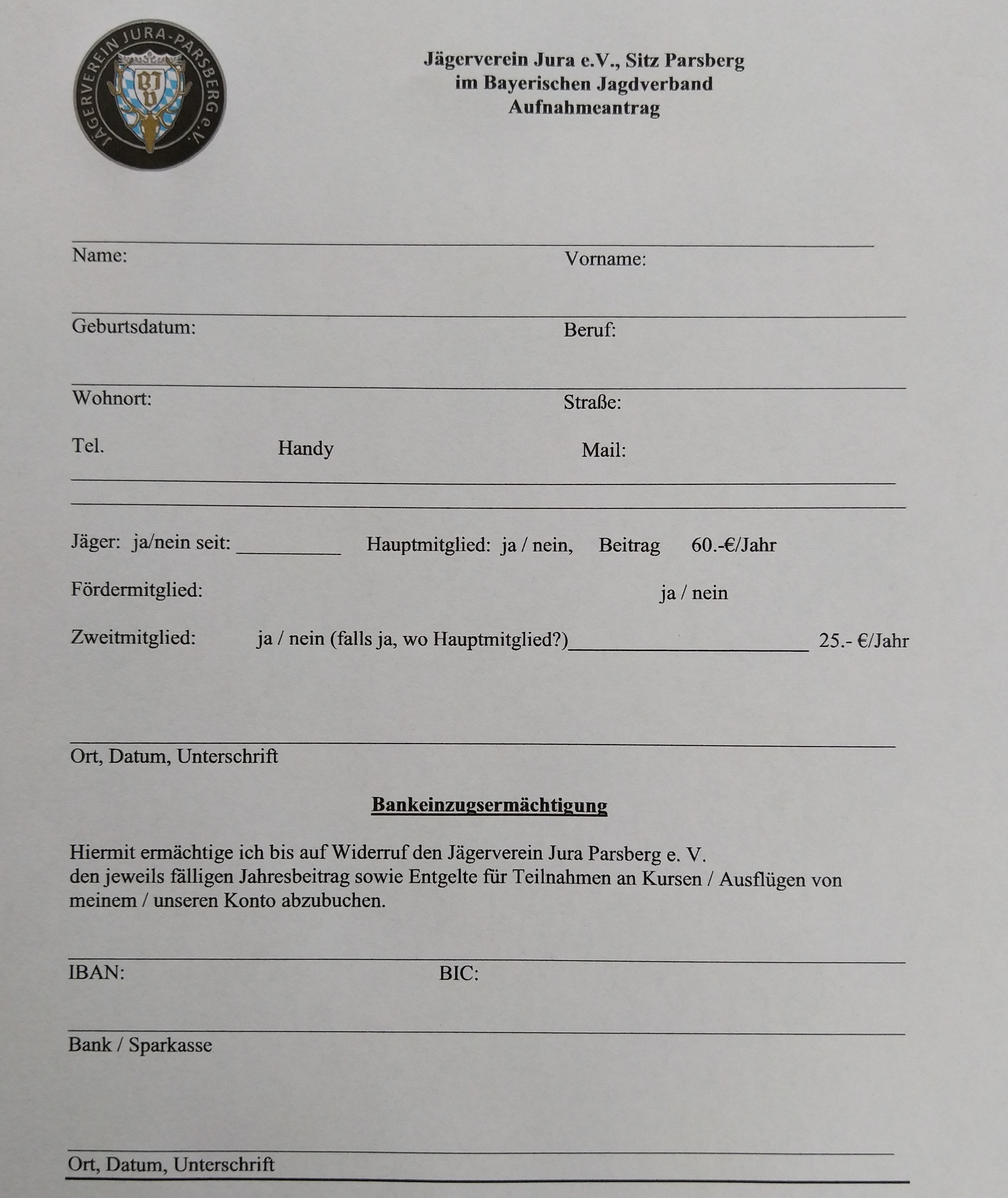 Der Jahresbeitrag im Jägerverein Jura e.V. Parsberg beträgt 60 Euro für ein Hauptmitglied ( davon müssen wir 49 Euro an den Bayerischen Jagdverband nach München abführen) und 25 Euro für ein Nebenmitglied ( dieser Betrag bleibt ganz in unserem Verein in Parsberg - wir brauchen für Nebenmitglieder nichts nach München abführen ).